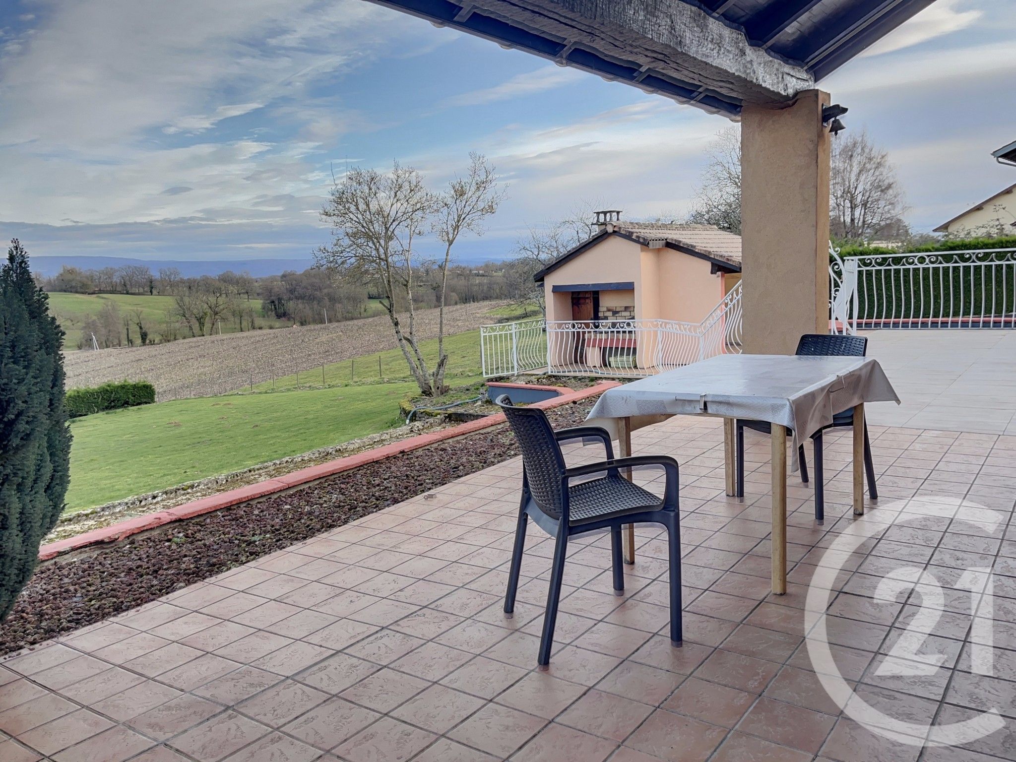 La terrasse couverte est idéale pour profiter des beaux jours et de la vue dégagée.